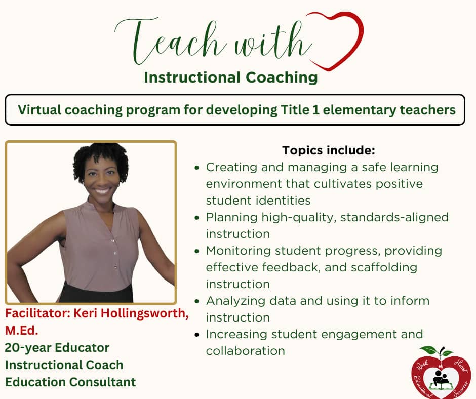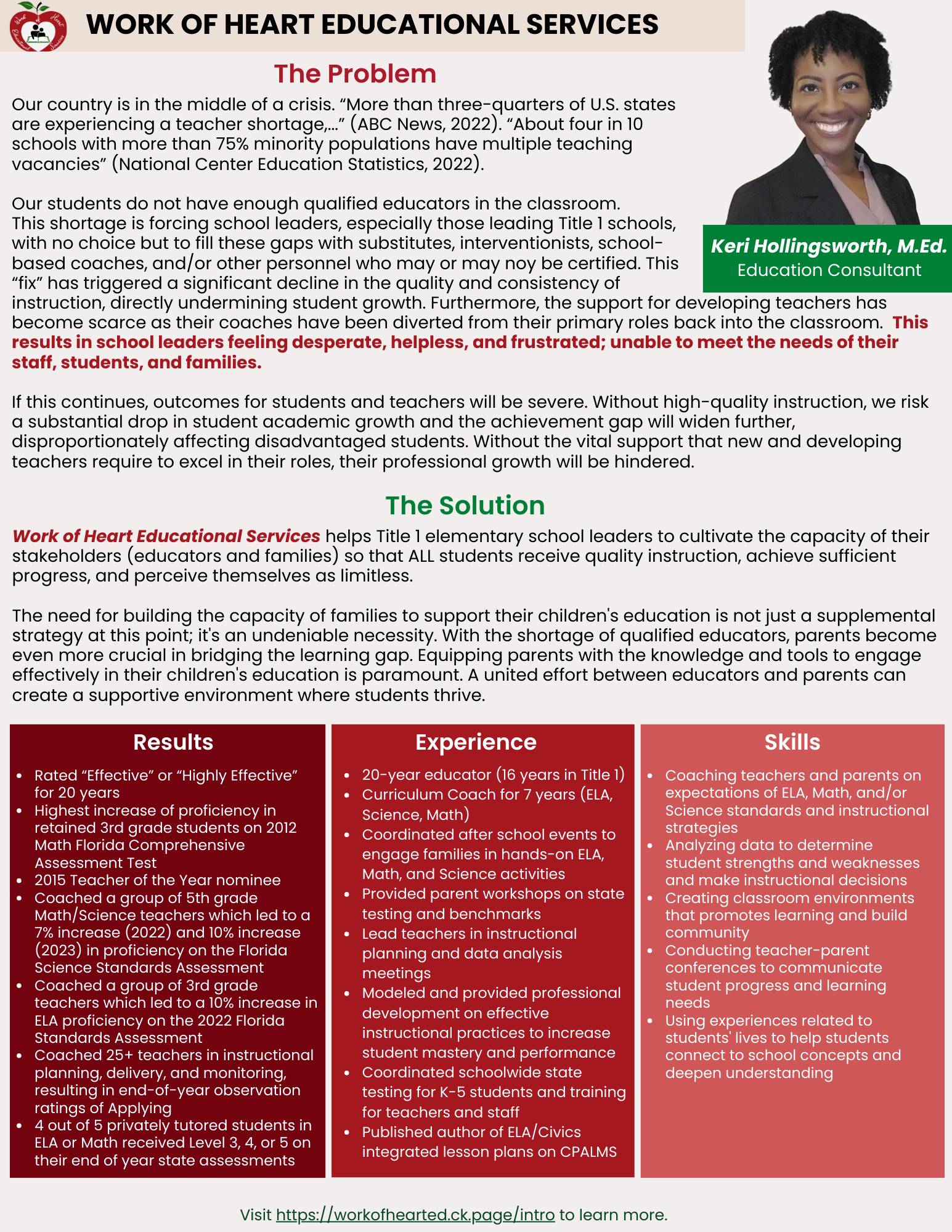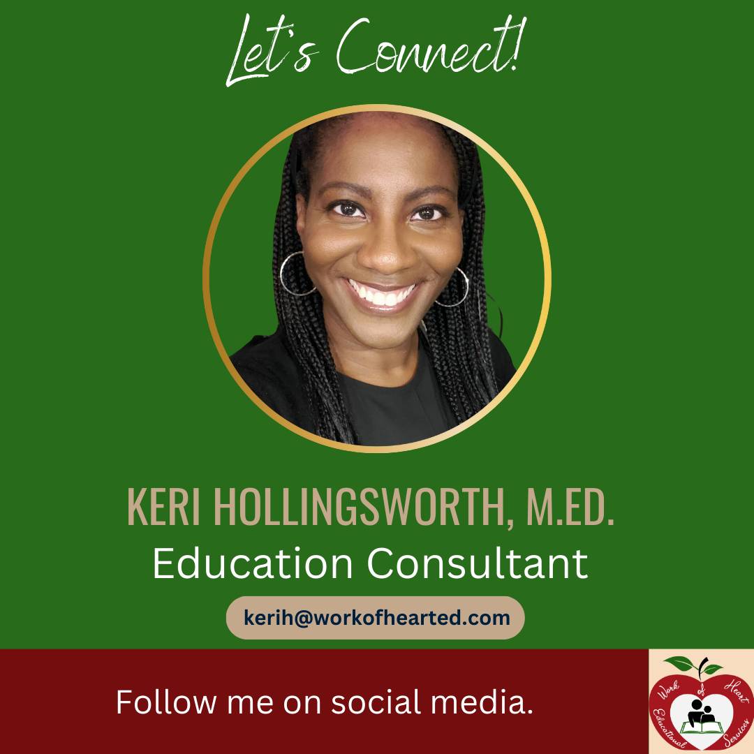 My name is Keri Hollingsworth, M.Ed. I am an education consultant and founder of Work of Heart Educational Services. I help Title 1 elementary school leaders cultivate the capacity of their stakeholders so that all students receive quality instruction, achieve sufficient progress, and perceive themselves as limitless.